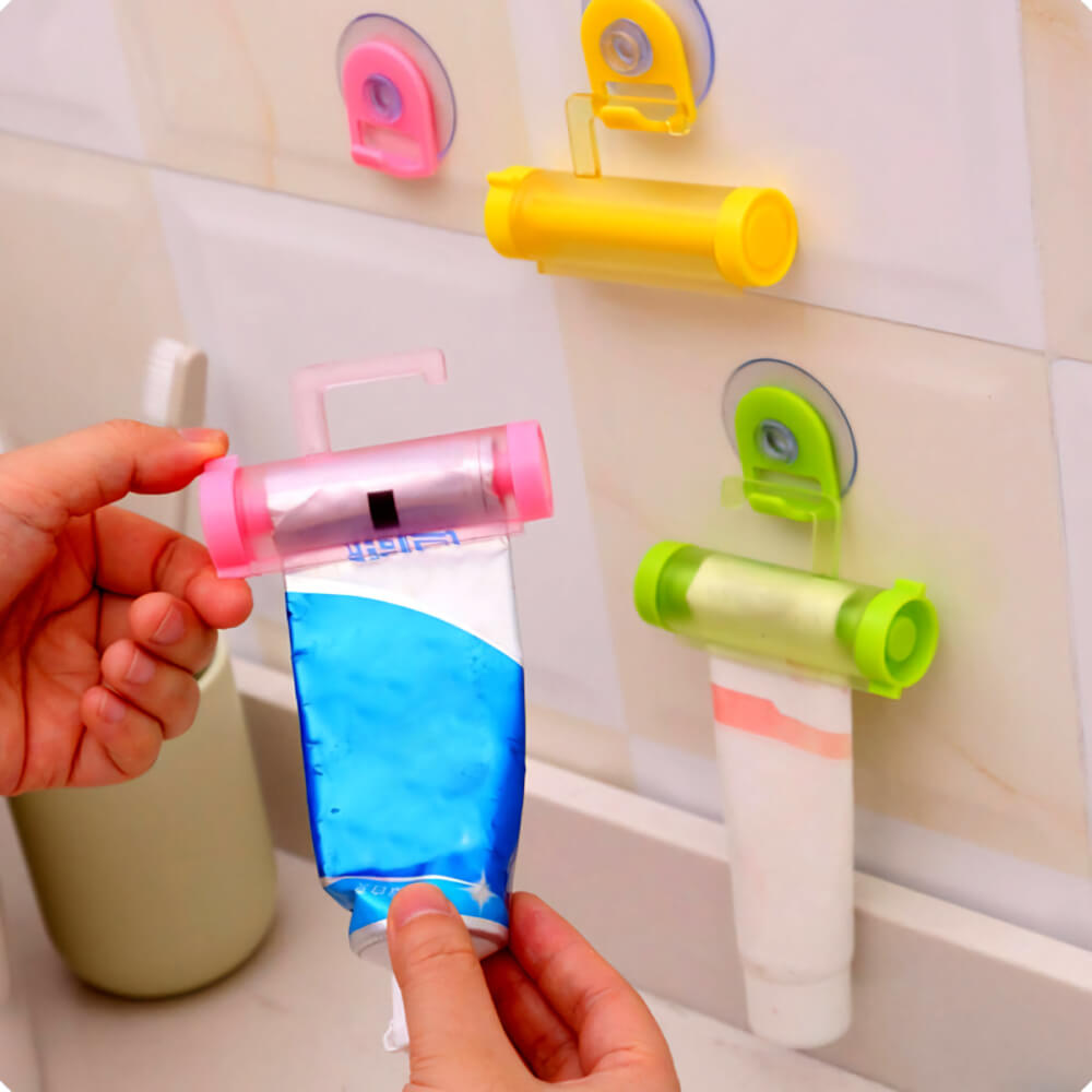 استند خمیر دندان آویز با کمک یک چسبک به دیوار متصل میشود و خمیردندان شما را تا اخرین قطره برای شما به راحتی با پیچاندن اهرم تخلیه میکند و هیچ چیز هدر نمیرود این تیوپ خمیر دندان رول شده در داخل یک محفظه جمع میشود و میتوانید مجدد از آن برای خمیر دندان بعدی استفاده کنید.