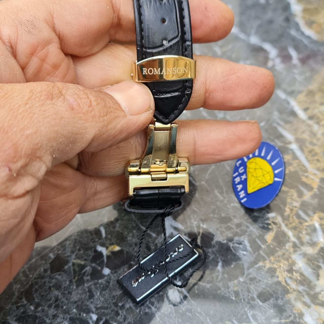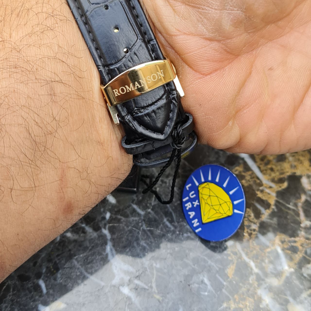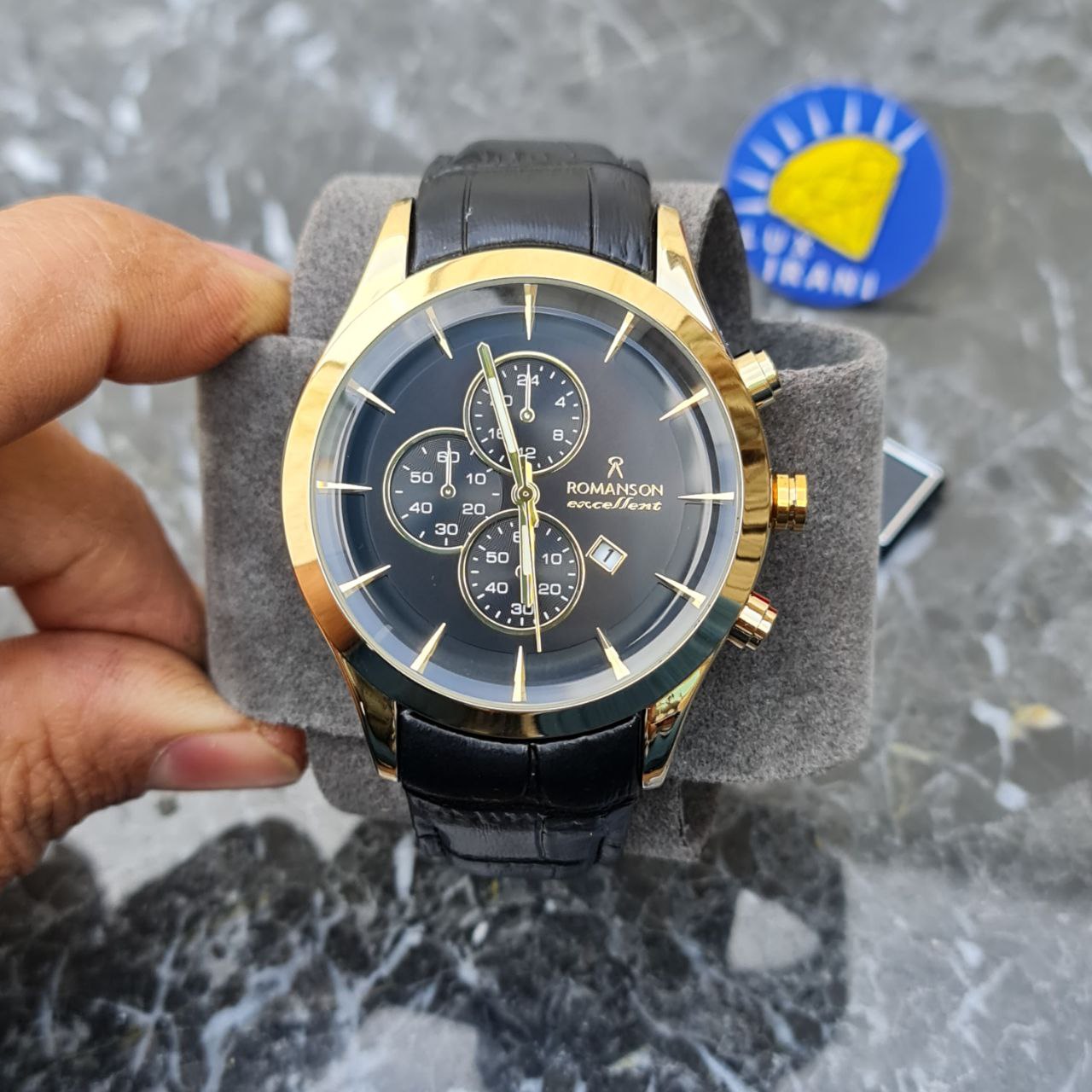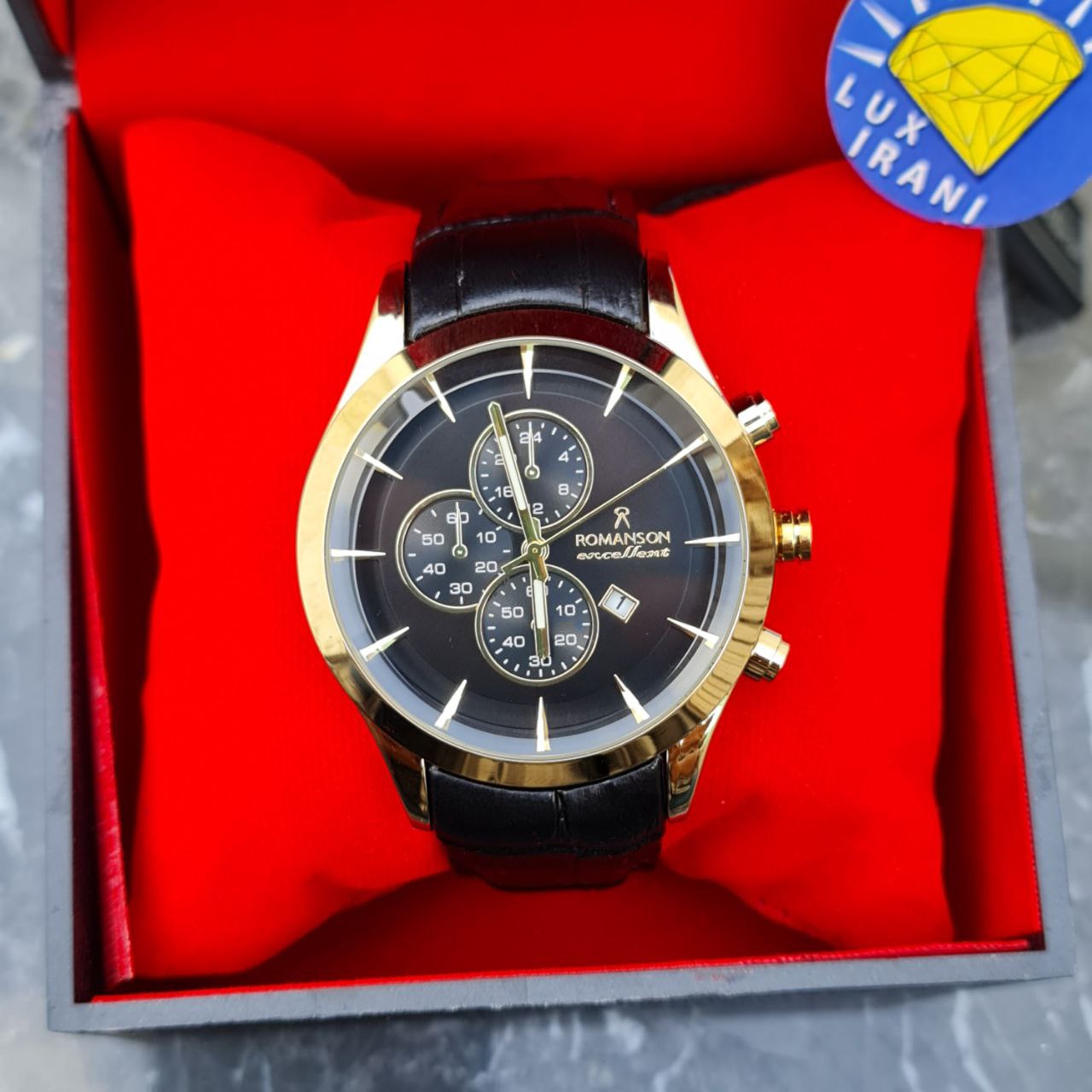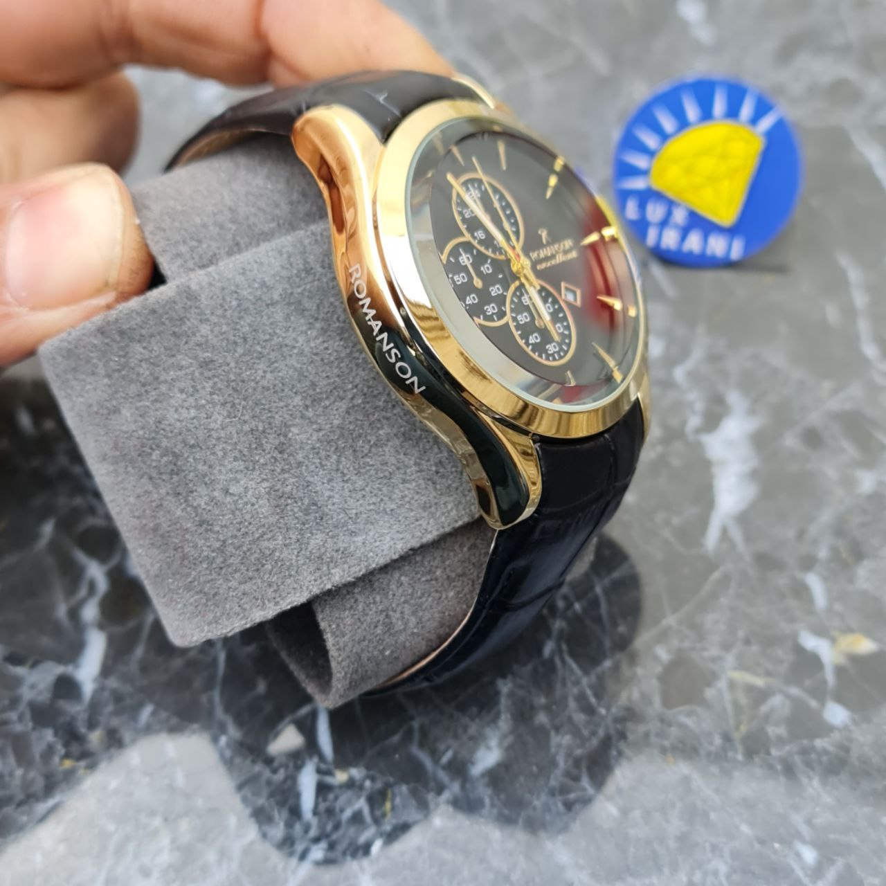 ساعت رومانسون الگانس کد 4711 بند چرم قاب طلایی صفحه مشکی