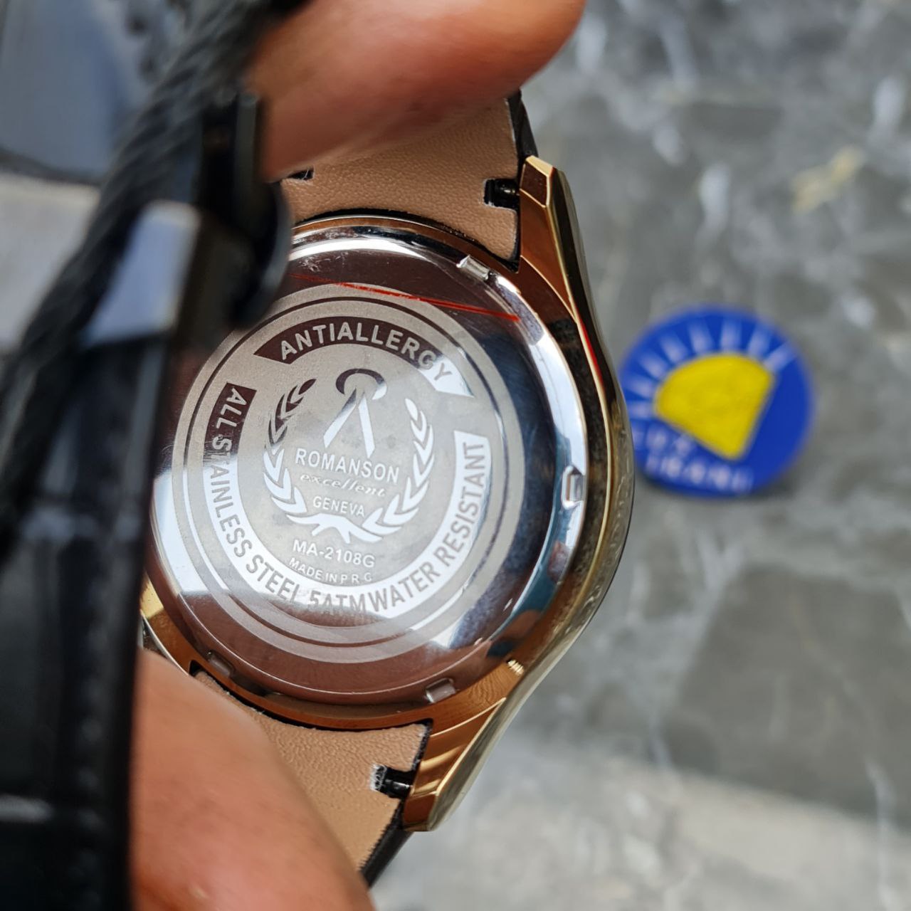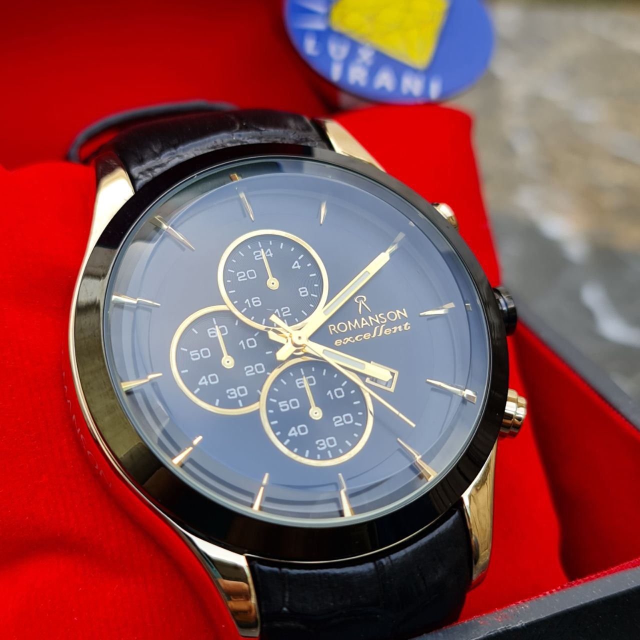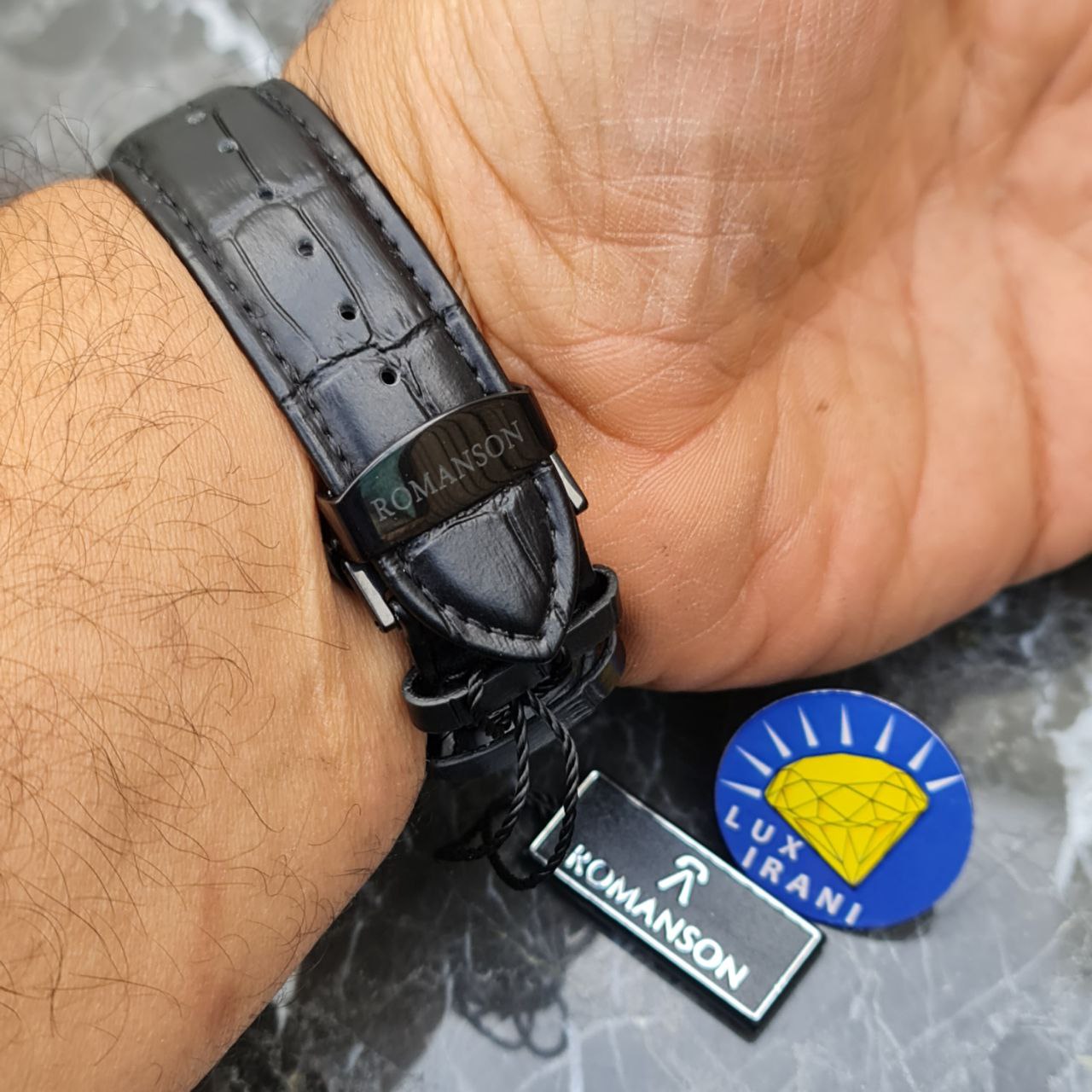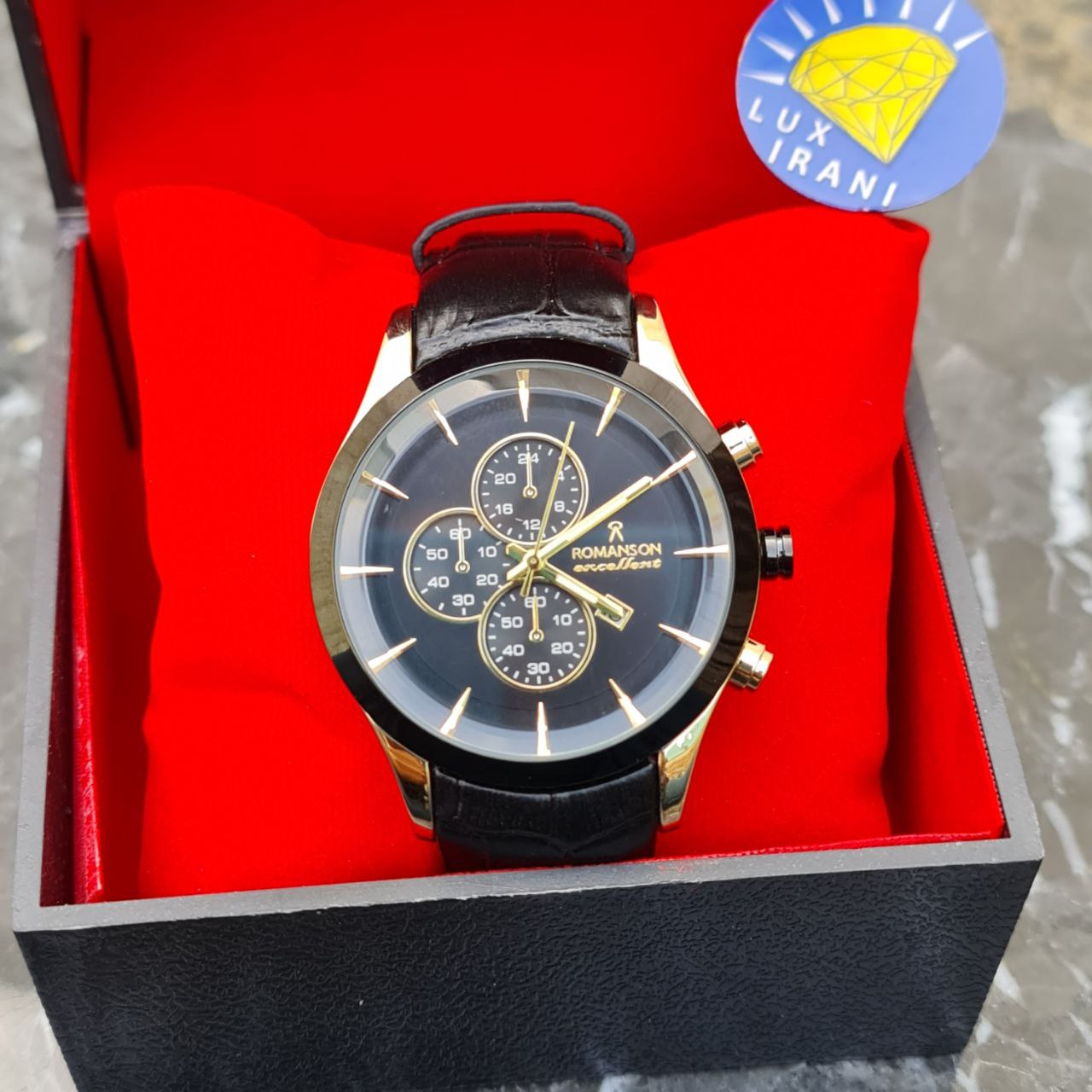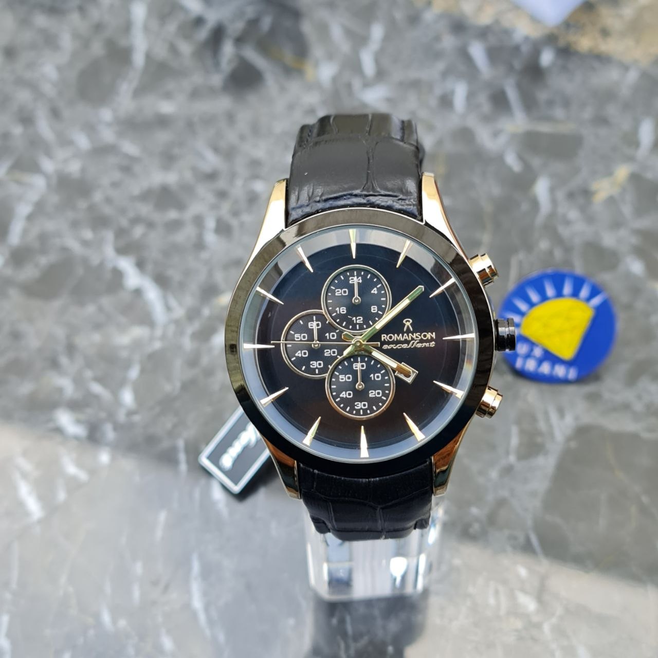 ساعت رومانسون الگانس کد 4712 بند چرم قاب مشکی و طلایی صفحه مشکی